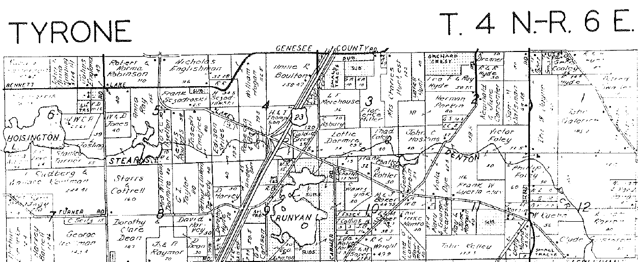 This entry was also posted, noting available resources after 1901 not yet mined. Twentieth Century Portland Cement Company. Organized March 2, 1901. Capital, $750,000.00. Office at Fenton and plant about four miles from the village, and stock said to be mainly held there. It is said that marl options are held on Runyan Lake, mainly in Sec. 9. Fast forward to 1965, below, and Runyan Lake remains as it appeared in the 1900 time frame.