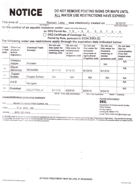 Thursday, June 10, 2010 for Pond Weed and Elodea Because of the cool spring weed growth thus far is limited to cool water weeds, such as Pond Weed. Aquatic Nuisance has determined the best treatment method is to spot treat the Pond Weed and some Elodea in early June and follow up with treatments for Northern Milfoil and other weeds as they grow to the point of requiring treatment. This treatment plan will not only keep unneeded chemicals out of the lake but will also save us the cost of chemicals that would have limited effect. Click here for the treatment map which shows the areas to be treated in crosshatch. Please watch for notices, which include water use restriction details, along your shoreline just prior to treatment. We will post the treatment day as soon as it is determined. Click here for a copy of the yellow notice posted along shorelines in the treatment areas.